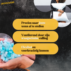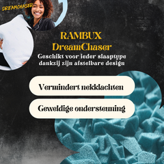 Het RAMBUX® DreamChaser hoofdkussen is geschikt voor buik-, rug- én zijslapers. Dankzij de aanpasbare vulling kun je het volledig afstemmen op jouw lichaam en slaaphouding. Of je nu een zachte, medium of stevige ondersteuning wilt.