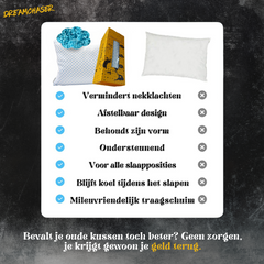 Het RAMBUX® DreamChaser hoofdkussen is ontworpen om je lichaam te ondersteunen zoals het hoort. Dankzij het versnipperde traagschuim ervaar je direct meer ontspanning in nek en schouders – en word je wakker zonder stijf gevoel. Eén nacht is genoeg om het verschil te voelen.