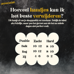 Iedereen slaapt anders. Daarom bepaal jij zelf hoeveel vulling jouw RAMBUX® DreamChaser nodig heeft. Gebruik de tabel als startpunt en stel het kussen bij tot het precies goed voelt. Zo vind je moeiteloos de perfecte balans tussen zachtheid en ondersteuning.